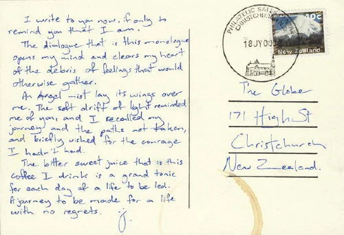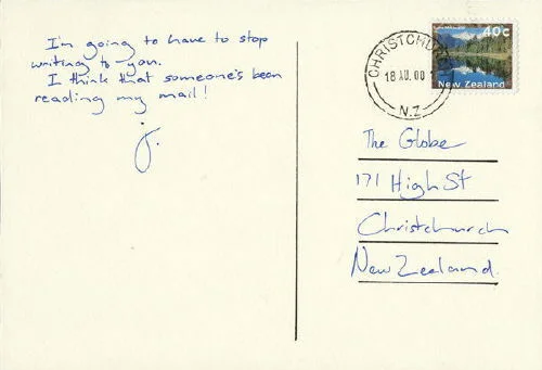 A handwritten postcard with a New Zealand postage stamp and a postmark from Christchurch, New Zealand, dated 18 August 2000. The message reads, "I'm going to have to stop writing to you. I think that someone's been reading my mail!" The postcard is addressed to The Globe, 171 High Street, Christchurch, New Zealand.